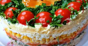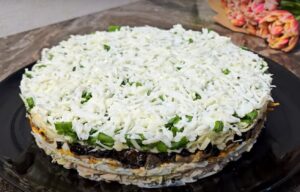 „Grybai po kailiu”. Paruošta be mėsos, bet pasirodo labai skanu: daugiasluoksnės salotos atostogoms.