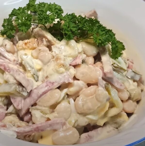 Rezultatas – paprastos, porcijinės salotos, pagamintos iš nebrangių ingredientų. Patiekalą galite papuošti žolelėmis – petražolėmis ir krapais.