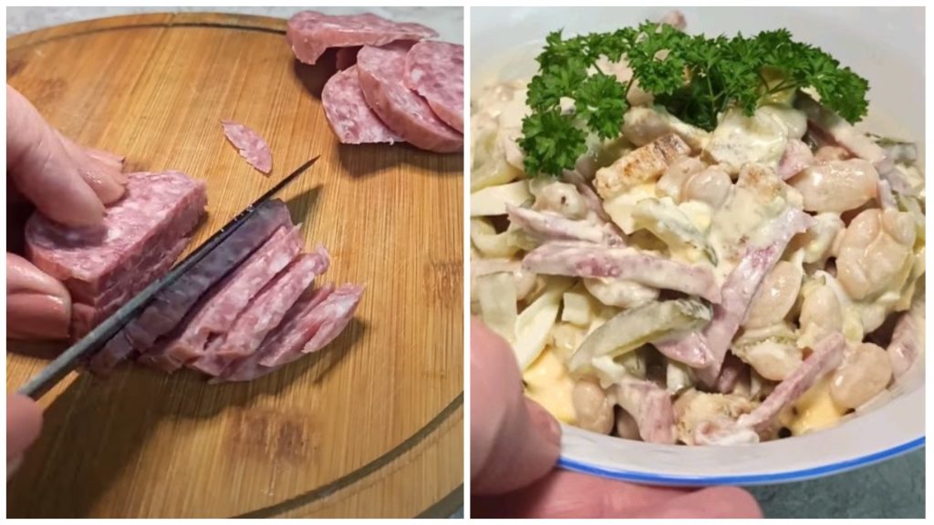 Į salotų dubenį sudėkite dešrą, kiaušinius ir marinuotus agurkėlius. Į salotas sudėkite krekerius ir konservuotas pupeles. Prieš tai nusausinkite pupeles nuo skysčio.