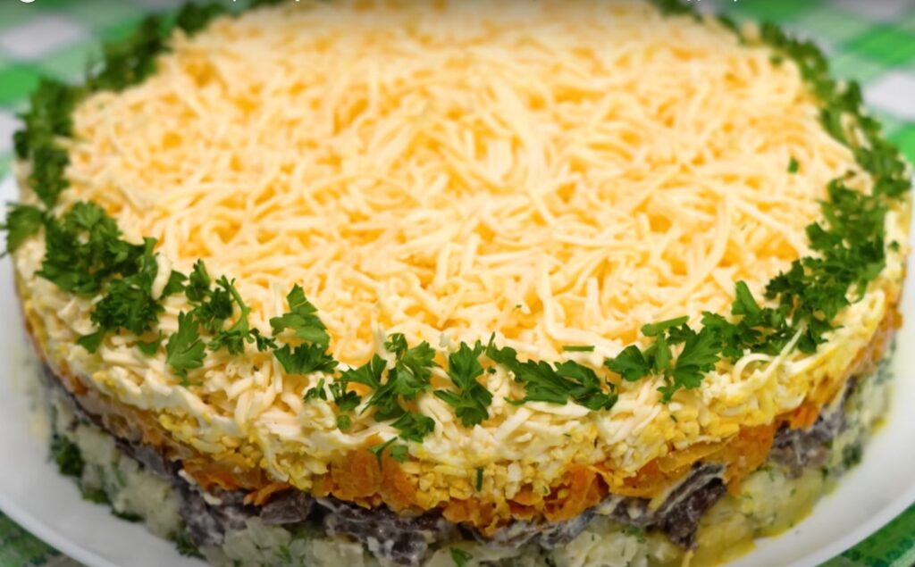 Keptuvėje pirmiausia pakepinkite svogūnus, tada sudėkite morkas. Apkeptas daržoves sudėkite į trečiąjį salotų sluoksnį, aptepkite majonezu