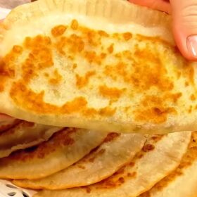 6 veiksmas. 6. Kai apačia paruduos, atsargiai apverskite paplotėlius. Jei kepėte su dideliu plokštainiu, leiskite jam šiek tiek atvėsti ir supjaustykite į patogius trikampius.